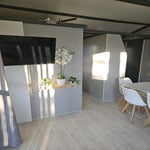 Côté chambres, on en a deux : une avec un lit double de 160 cm, deux coussins, une couette et un drap-housse, et l’autre avec 3 lits simples, chacun avec son coussin et son drap-housse. Chaque chambre a des armoires bien pratiques pour ranger vos affaires.