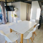 La cuisine équipée est ouverte sur le salon. Vous y trouverez une grande table pouvant accueillir 6 à 7 personnes, et un canapé-lit BZ avec un matelas de 10 cm d’épaisseur, en plus d’un surmatelas de 140 cm pour 2 personnes si besoin, drap-housse inclus.